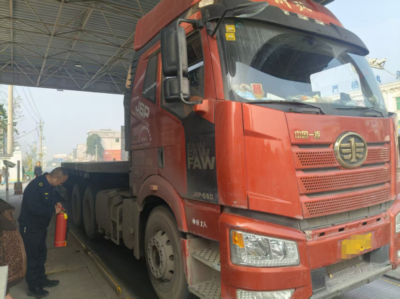 “货车发电机冒烟起火了!”2025年12月11日9时50分,崇阳县下津超限检测站地磅区域突发紧急情况,一辆正在进行称重检测的平板货车发电机突然窜出火苗,现场情况危急。