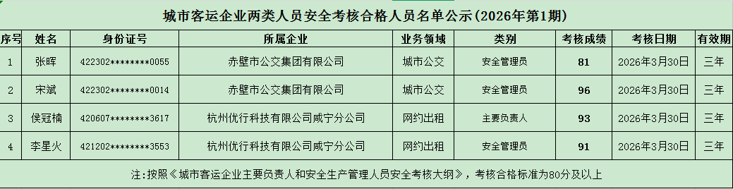 按照交通运输部关于印发《城市客运企业主要负责人和安全生产管理人员安全考核管理办法》《城市客运企业主要负责人和安全生产管理人员安全考核大纲》的通知要求,2026年3月30日,咸宁市交通运输局组织开展了2026年第一期“两类人员”安全考核工作,其中城市客运企业主要负责人和安全生产管理人员考试合格4人,现将考试合格人员名单公示如下: